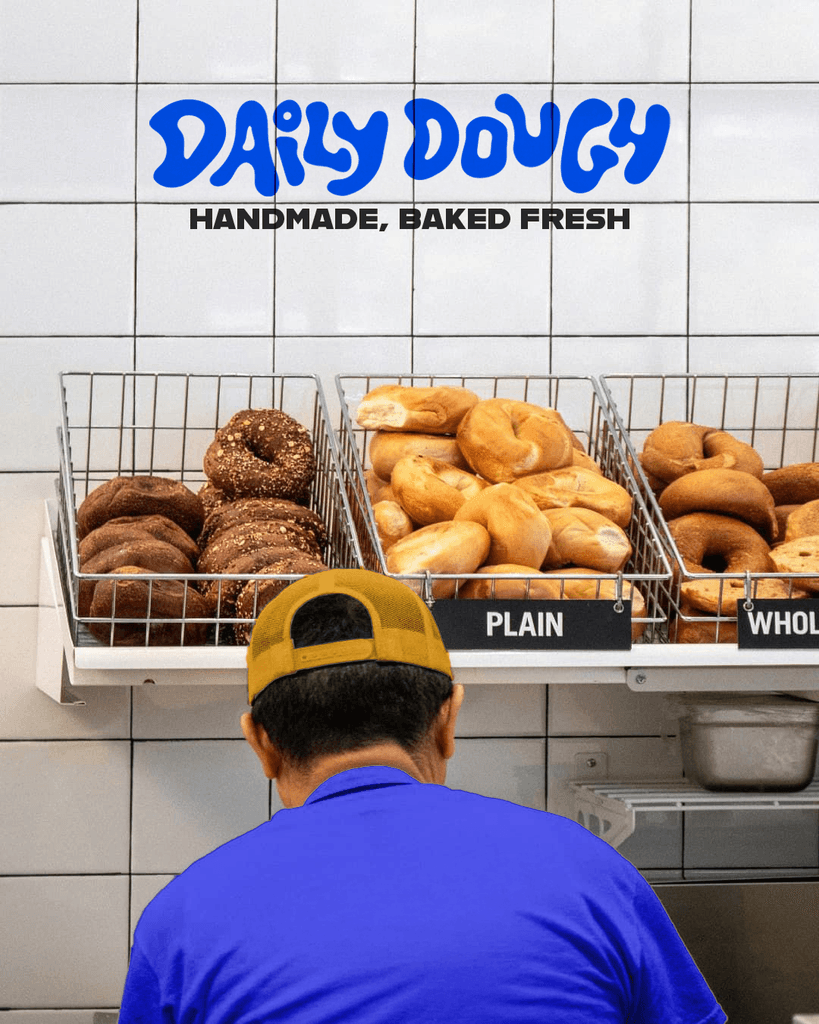 Cool, bold, and against the grain, Daily Dough is the New York bagel shop for those who speak their mind and love fresh dough. It's targeted for Gen Z and Gen Alpha, and highlights New York's skate, grunge, and street life. It pays homage to the bagel's origin in New York and always makes bagels the traditional way: Fresh, boiled, and by hand.