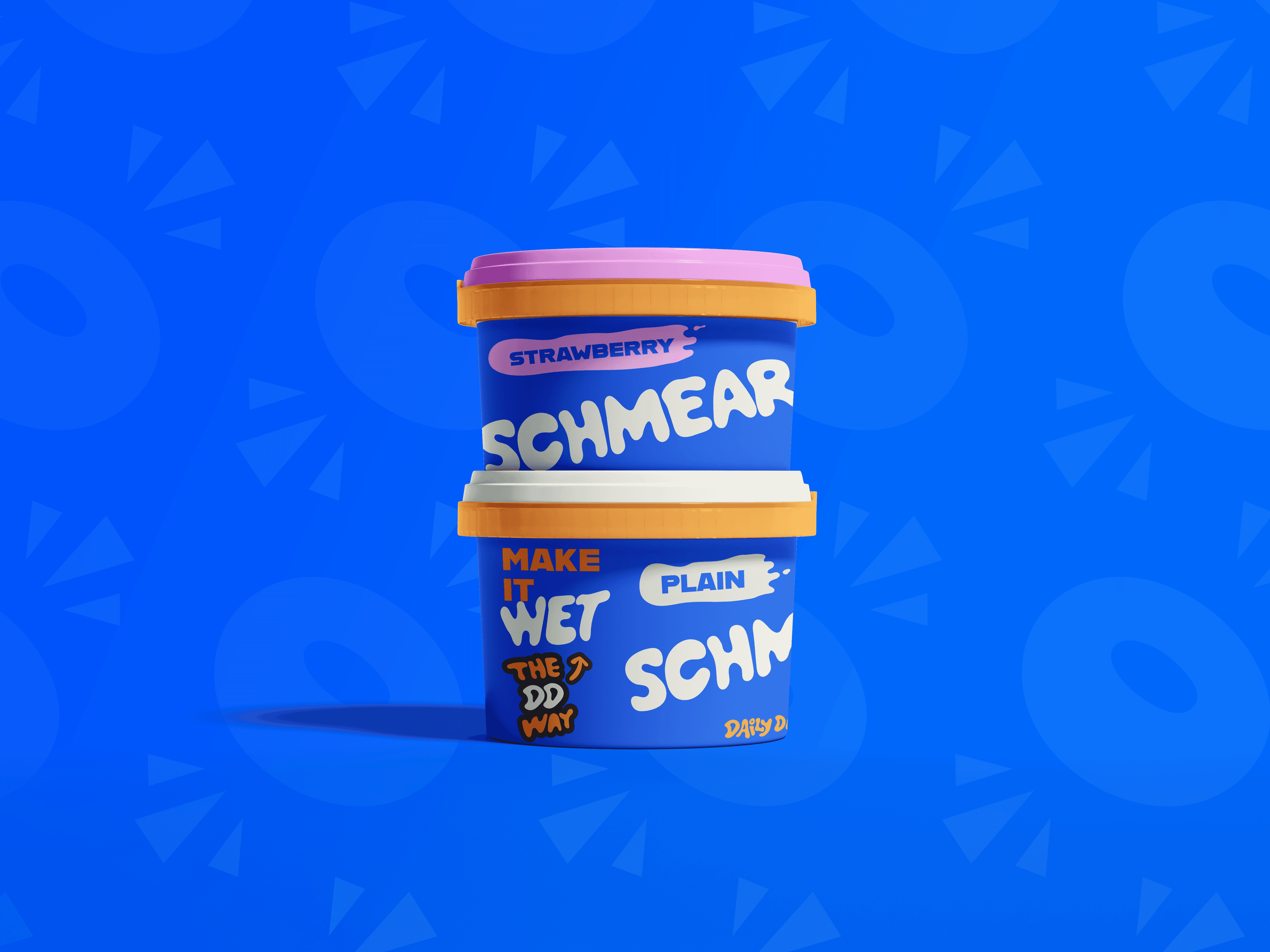 The wordmark is fluid, imitating the hand-rolled bagel dough before it's boiled. I wanted the letters to be both dough-y and also mimic graffiti tags seen on the walls around the shop. The colors are bright and meant to catch your attention. DD's mascot is Davey Doughboy, and he represents the attitude of the shop with a laid-back walk and casual hand in the pocket. His fit consists of baggy jeans, a baseball cap, (not) Air Jordan's, and his classic DD skateboard.